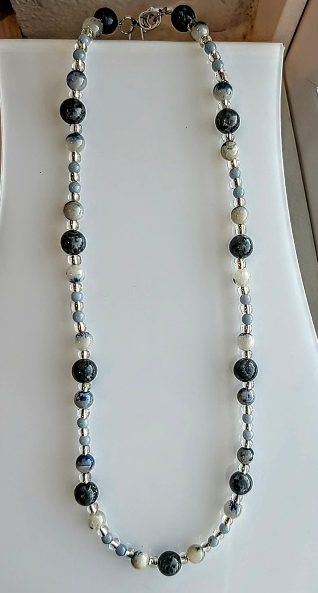 When exams are near or you have a big project due, life can be stressful. This necklace of Dumortierite, Larvikite, and Angelite will help you keep your cool by promoting memory and focus, helping to organize your thoughts, and aiding in clear communications.