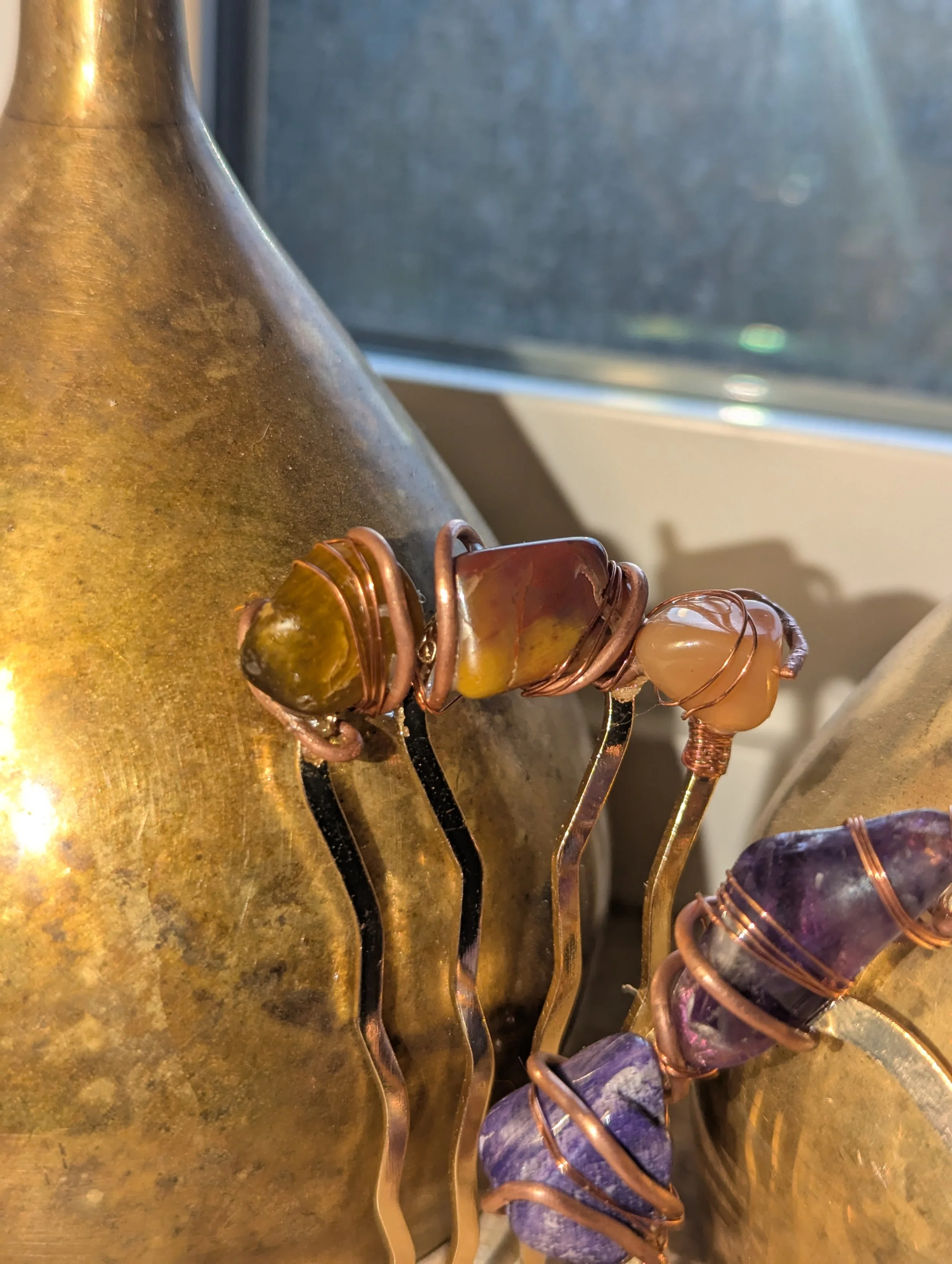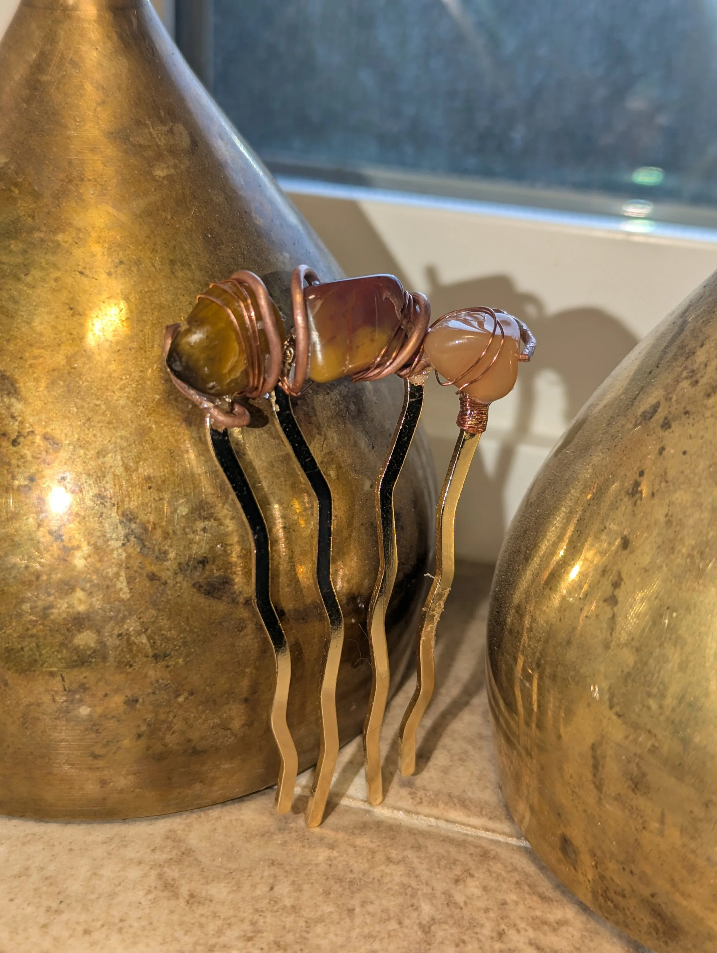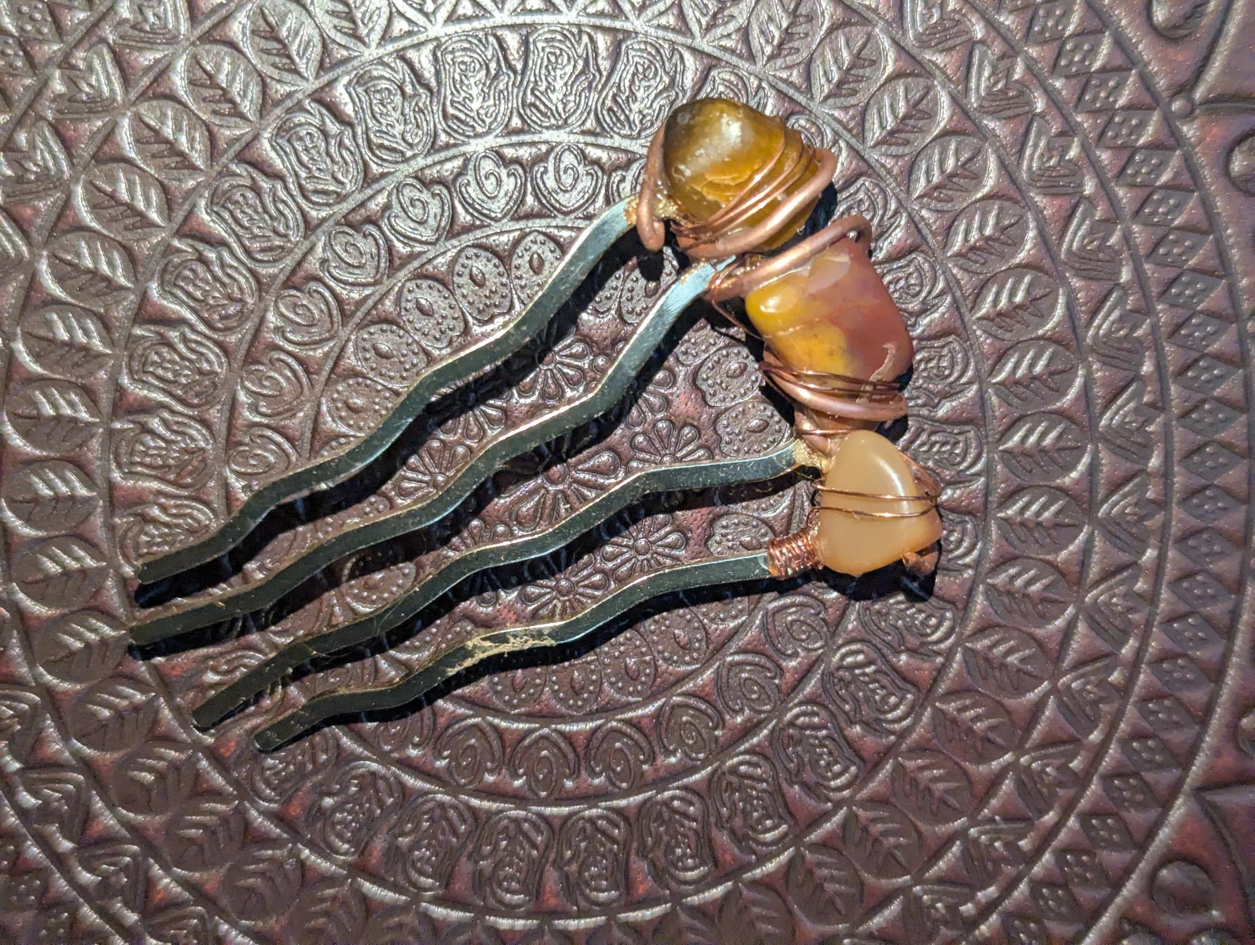 Mountain's Heart Artisanry › Tiger's Eye Hair Pin Image 1 of 4 Image 2 of 4 Image 3 of 4 Image 4 of 4 Tiger's Eye Hair Pin $30.00 2.75 inches x 1.5 inches, Tiger's Eye, Montana Agate, recycled 8 & 18 gauge copper. Add to Cart Added! 2.75 inches x 1.5 inches, Tiger's Eye, Montana Agate, recycled 8 & 18 gauge copper.