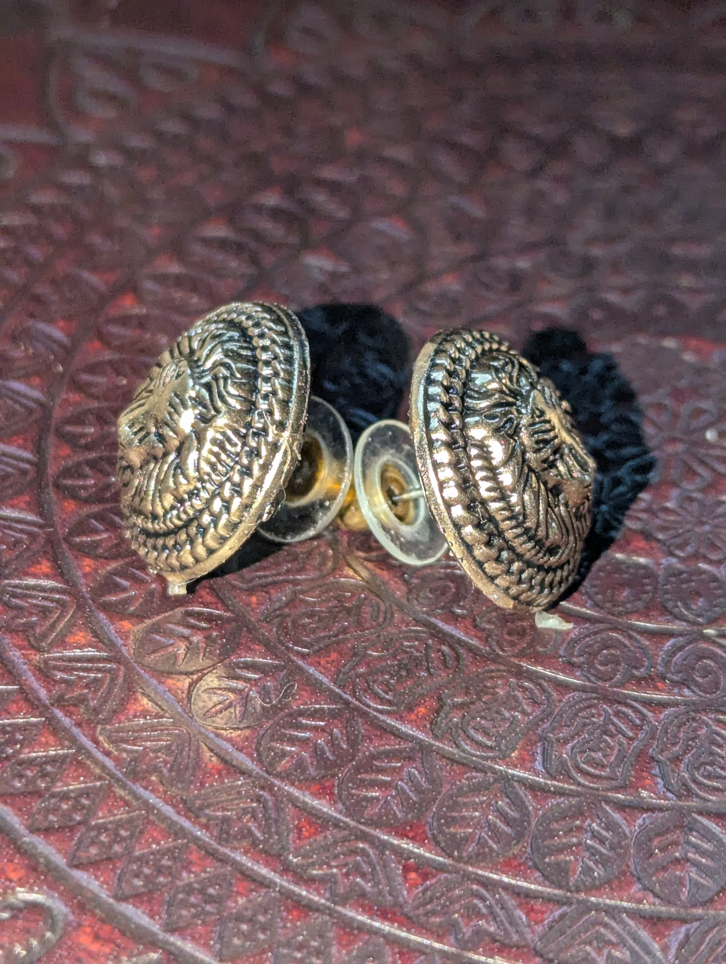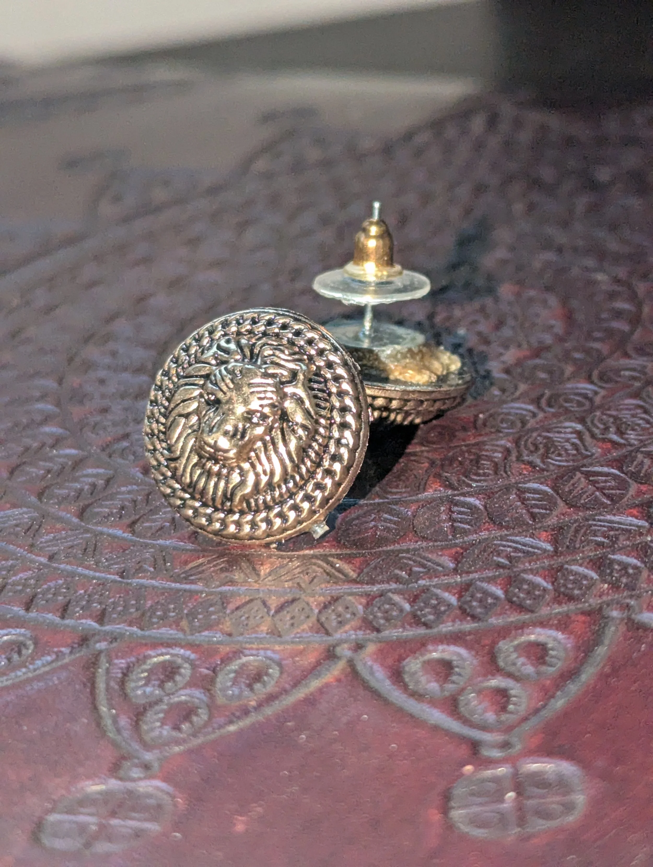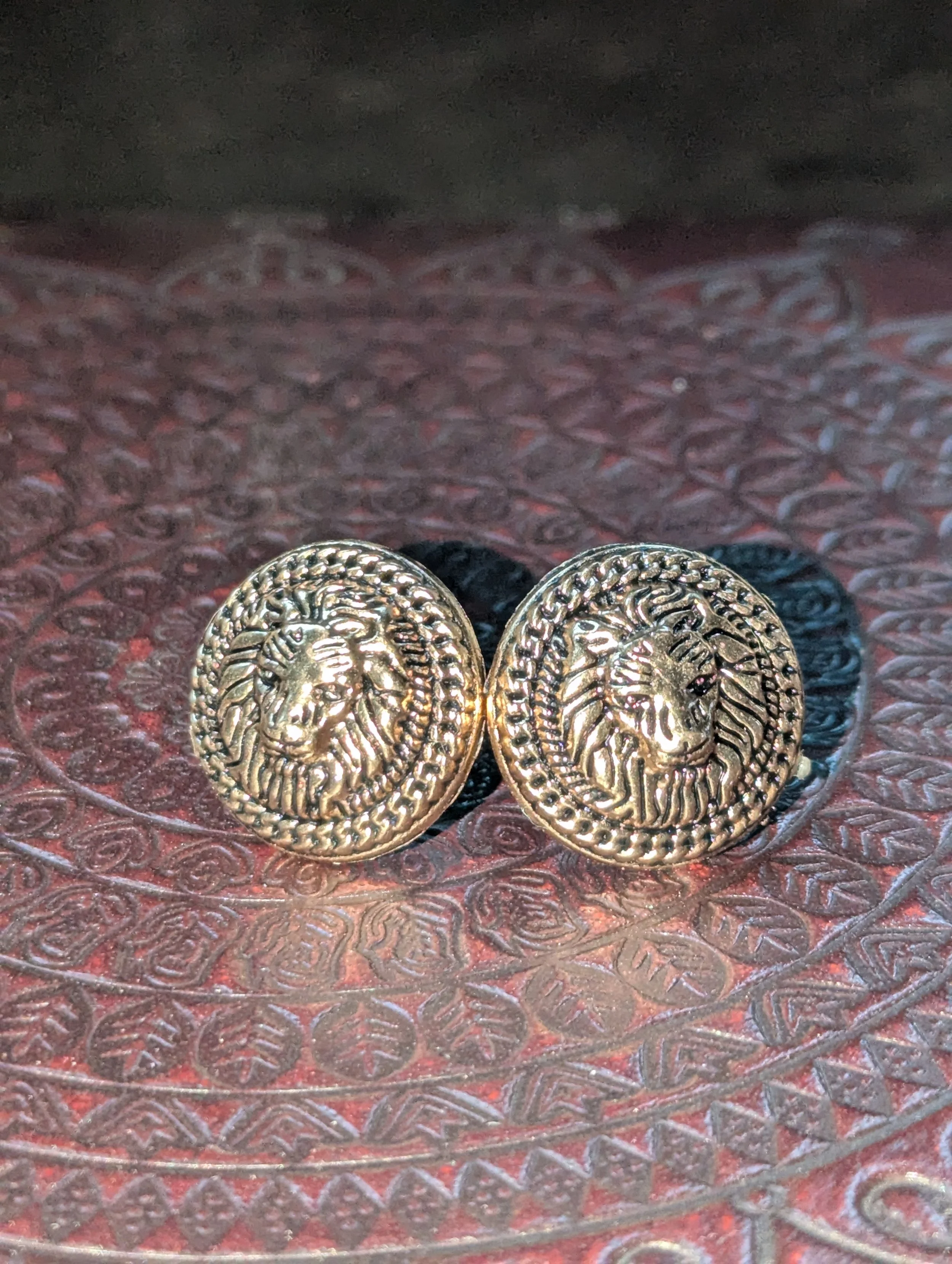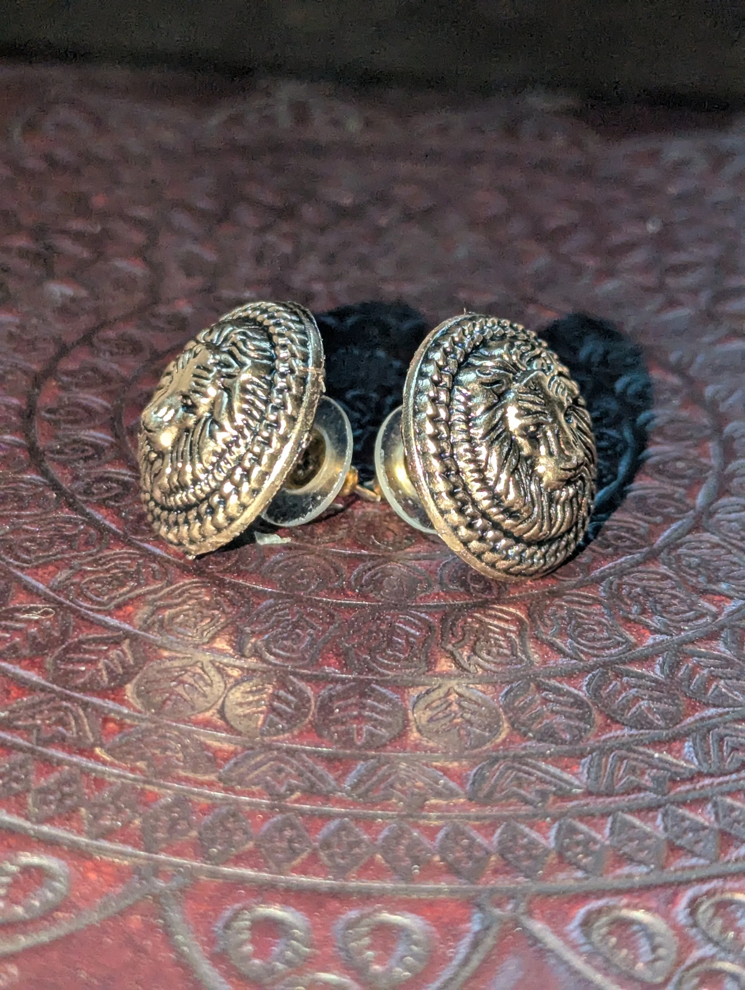 Mountain's Heart Artisanry › Brass Lion Earrings Image 1 of 4 Image 2 of 4 Image 3 of 4 Image 4 of 4 Brass Lion Earrings $20.00 .75 inch repurposed brass button earrings. Add to Cart Added! .75 inch repurposed brass button earrings.